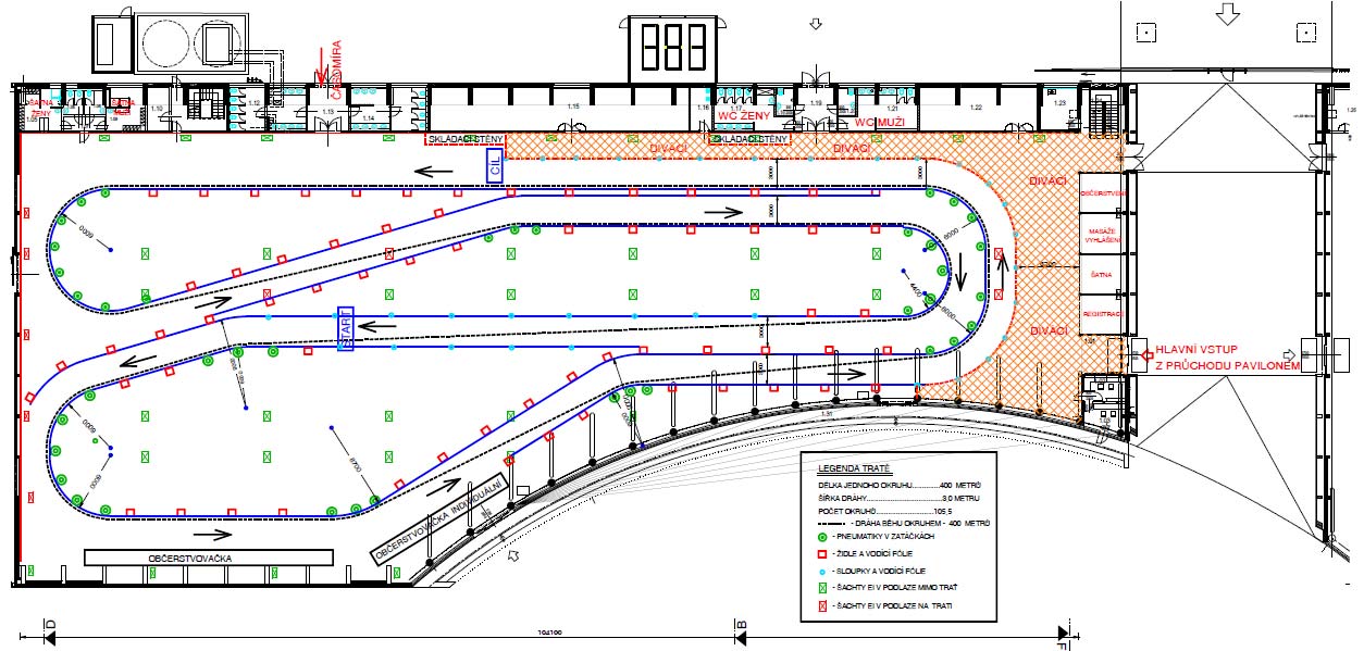 Po dvou letech jsem se opět vypravil do Českých Budějovic na indoor maraton. Tentokrát se změnila lokalita a neběželo se v podzemních garážích nákupního centra, ale na výstavišti v pavilonu T1. A výběr tohoto místa se mi zdál mnohem lepší než v Mercury. Pocitově větší a prostornější, člověk měl stále přehled o svých soupeřích a celkově závod mnohem lépe ubíhal. Okruh měřil 400 metrů a měl 4 zatáčky, celkem tedy 105,5 okruhů a přes 400 zatáček.