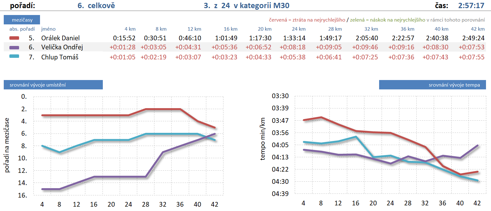 Nakonec se mi ho podařilo předběhnout a já se začínal soustředit na čas pod 3 hodiny. Těmito výpočty jsem strávil prakticky zbytek závodu. Z 15 místa na začátku jsem se postupně svým velmi vyrovnaným tempem probojoval až na sedmou pozici. A shodou náhod jsem při vbíhání do posledního kola zpozoroval na projektoru, že Tomáš Chlup běží kousíček přede mnou a tak jsem chtěl ještě zkusit zabojovat. Těch pár metrů jsem stáhl, ale Tomáš bojoval a nechtěl mi nic nechat zadarmo. Výsledkem pro mě bylo celkové šesté místo a poslední kolečko za 1:26, což v přepočtu vychází na 3:35 min/km. Pro mě to byl důkaz, že jsem se v průběhu závodu možná až zbytečně šetřil a vše odběhl naprosto v pohodě bez jakékoli krize ve velmi rovnoměrném tempu. S časem 2:57:17 jsem obsadil dokonce krásné 3 místo v kategorii.