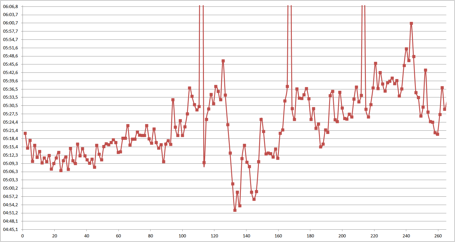 Samostatnou kapitolou by mohly být mé zastávky na záchod. Když jsem si říkal, že bych si mohl preventivně odskočit, připravil jsem se, ať vše rychle zvládnu co nejrychleji a neztrácím čas. Bohužel kabinka byla obsazená a já musel běžet dále. Na další záchod jsem to již úplně nevydržel a protože nejsem Camille Herron, likvidoval jsem následky hned při první příležitosti více než 5 minut. Graf výše vyjadřuje vývoj mého tempa v průběhu závodu, na ose X jsou kilometry, na ose Y je tempo jednotlivých okruhů. Pro lepší rozlišení grafu jsou ořezané 3 okruhy, které obsahovaly zastávky na záchod, tempa těchto kol byla 9:16, 7:23 a 6:46 min/km. Poslední čtvrtá záchodová zastávka byla již jen na malou a ta se do grafu vešla. V grafu lze hezky pozorovat noční zrychlení, kdy jsem postupně začal z tempa cca 5:30 zrychlovat na tempo pod 5 min/km a dokázal chvíli toto tempo držet. Po 160 km je také vidět pokles tempa, které bylo způsobeno neposlušným žaludkem. Ačkoli jsem se z toho dokázal dostat, tempo se již pod 5:15 min/km nedostalo.