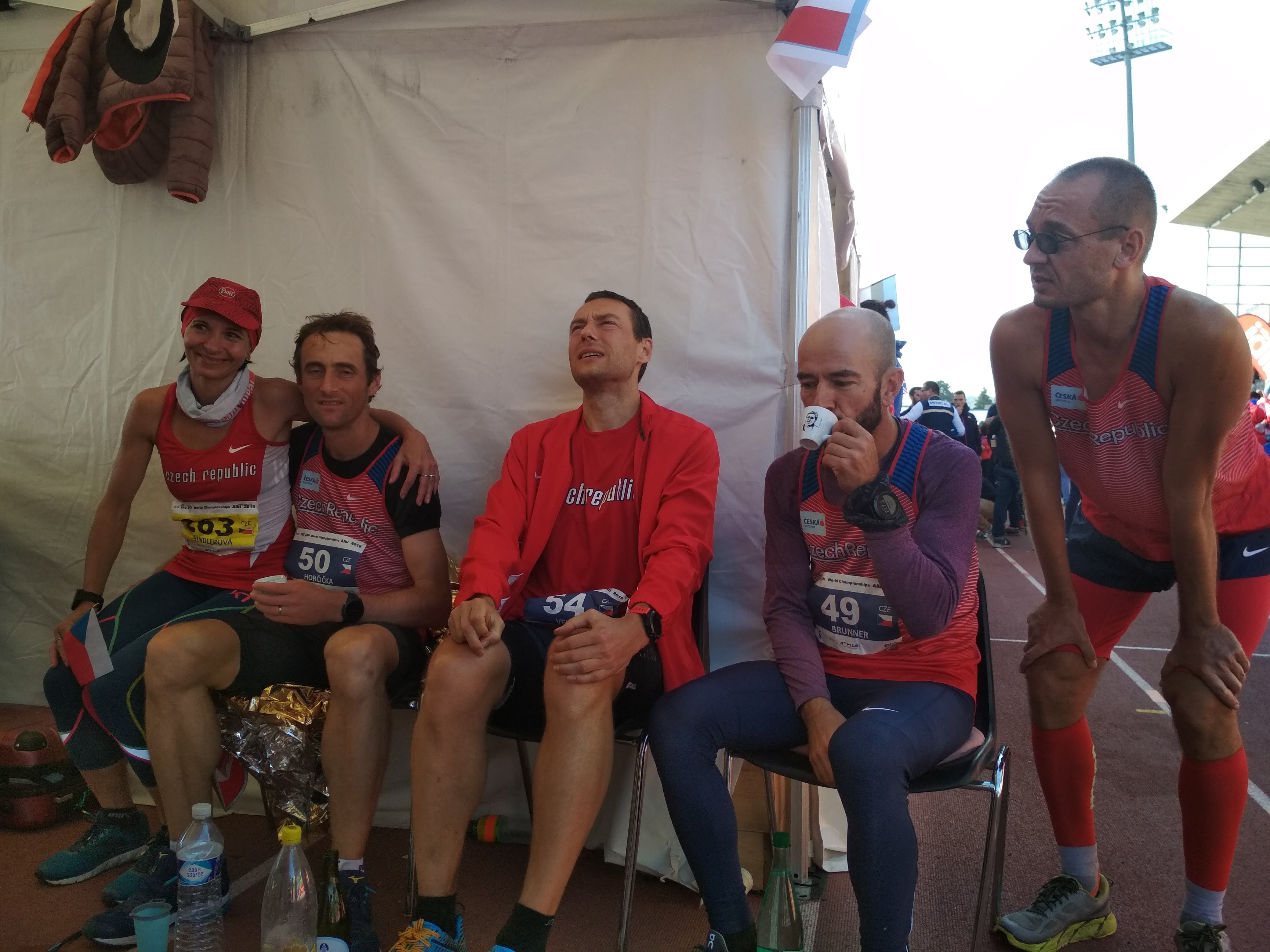 Těsně po dosednutí na židli v našem stanu na konci závodu.