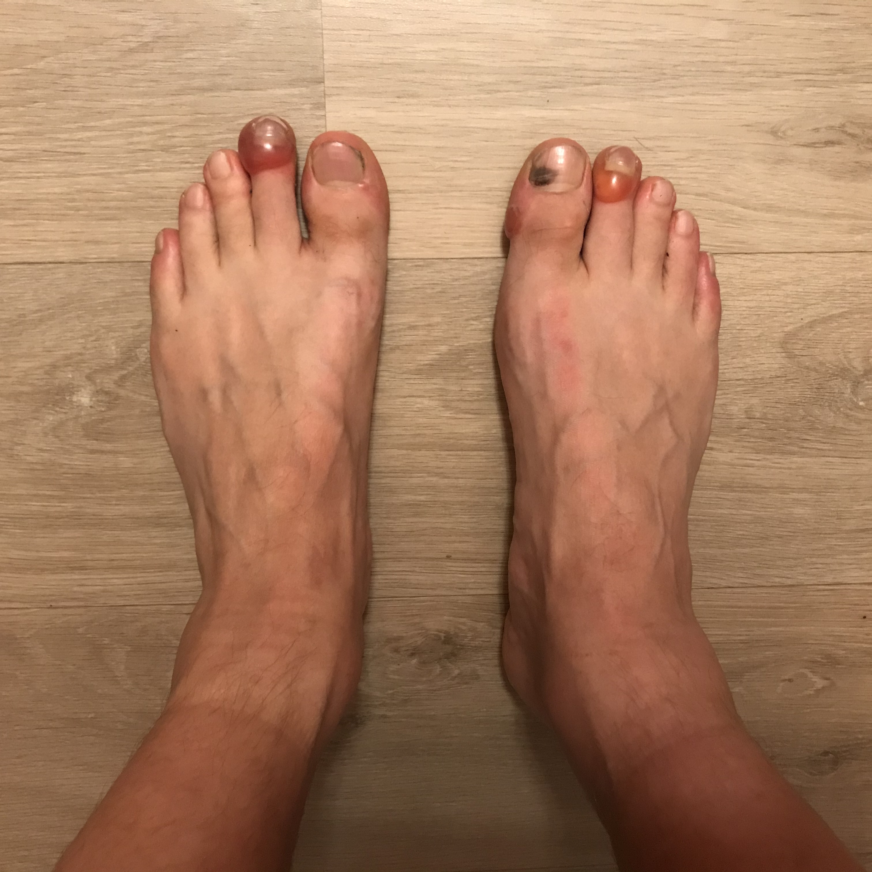Moje nohy s puchýři na konci závodu.