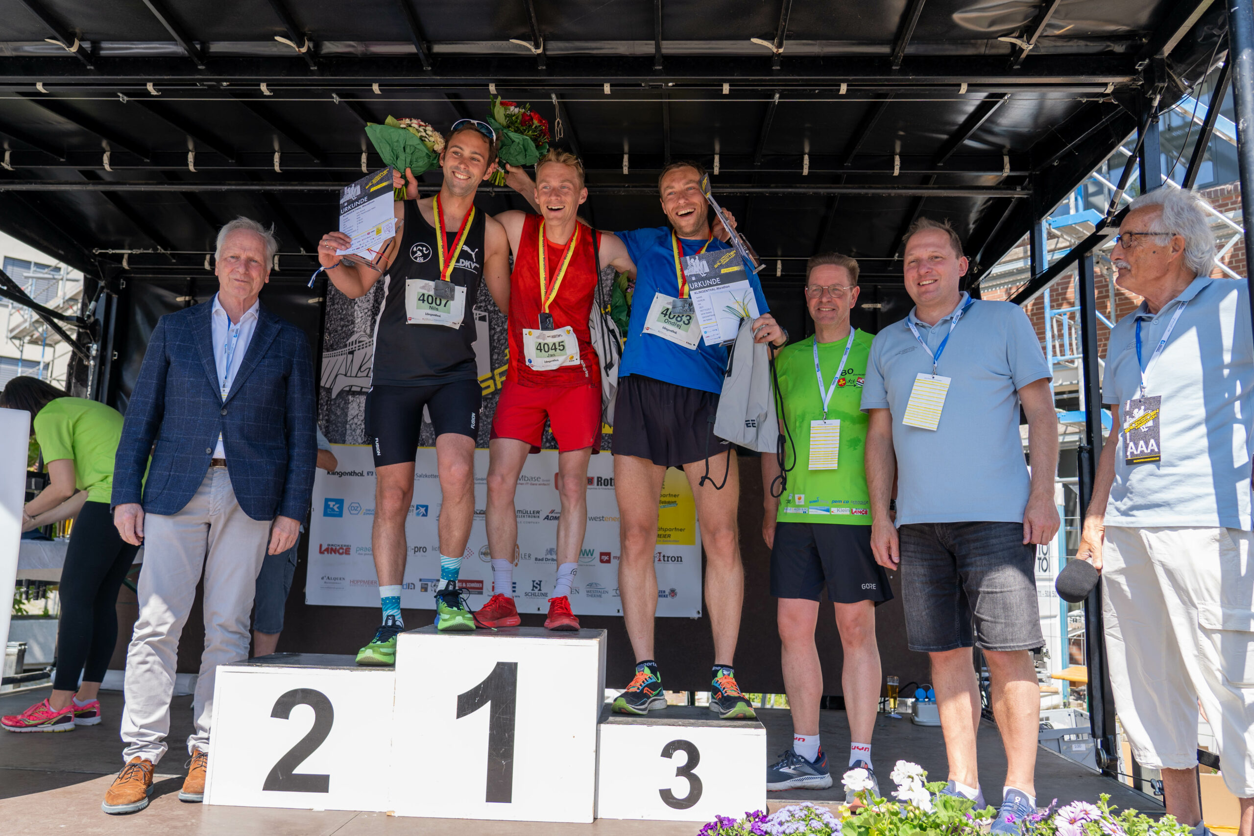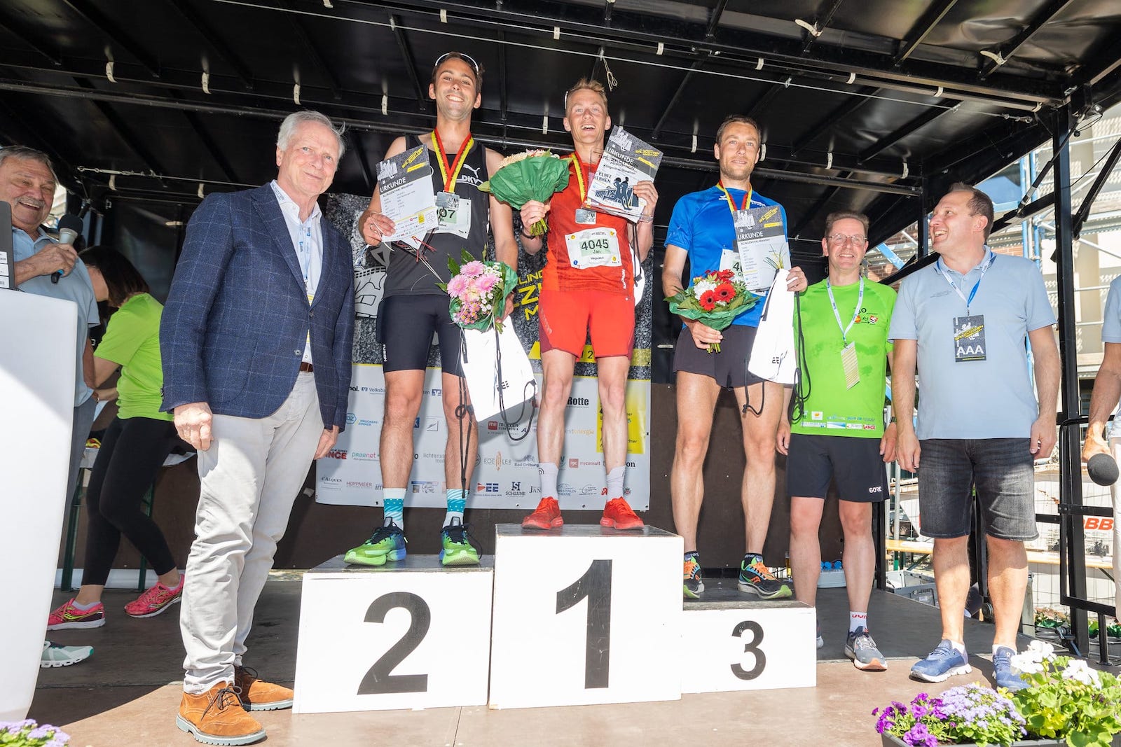 Poslední kilometr jsem již sotva plantal nohama, zvlášť když obsahuje nejméně oblíbený úsek po trávě a šotolině, který vyčerpává nejen v posledním kole. Do cíle jsem ale doběhl s časem 2:48:35 a tak jsem splnil svůj plán pro tento závod. V cíli mě čekala Barča a rychle po vypití několika kelímků Coly a vody jsme společně vyrazili na start jejího závodu, který byl v 11:30. Následně jsem vyrazil do našeho zázemí na nealko pivo a při té příležitosti se dozvěděl dosti potěšující zprávu, že jsem byl celkově třetí. Vzhledem k tomu, že jsem neměl žádný přehled ani informace v průběhu závodu, moc jsem v dobré umístění nedoufal. Po chvíli již začali z pódia vyhlašovat moje jméno a já spěchal na vyhlášení. Krásně to vyšlo, protože Barča dobíhala krátce po ceremonii a tak jsem ji mohl v cíli jejího prvního závodu předat kytku z mého vyhlášení.